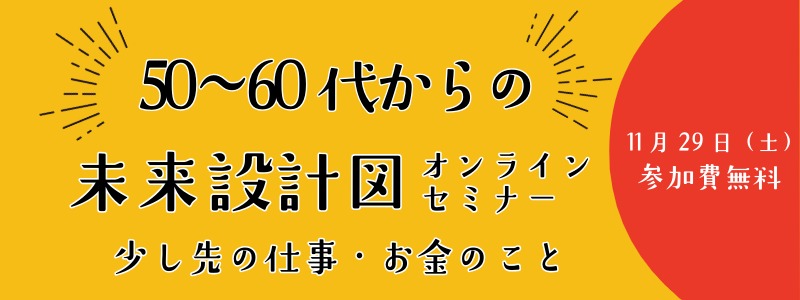 キャリアとお金、少し先の未来設計図を、一緒に作ってみませんか。 開催日:2025年11月29日(土) 09:30〜12:15(9:20よりZOOM入室受付開始) 講義だけでなく、グループワークなどの交流も。参加者同士のつながりを大切に、少し先のライフデザインを共に考える時間をご提供します。 事前予約はこちらから/締切11月25日(火)23:59迄 対象 50… -