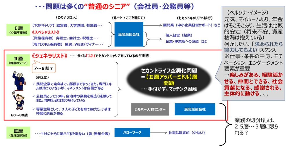 Ⅱ層がいわゆる「普通のシニア」です。Ⅱ層の人たちは最もボリュームが多く、例えば、ジェネラリストとして民間企業などで定年まで働いてきた人、あるいは子育てが終わった専業主婦などです。